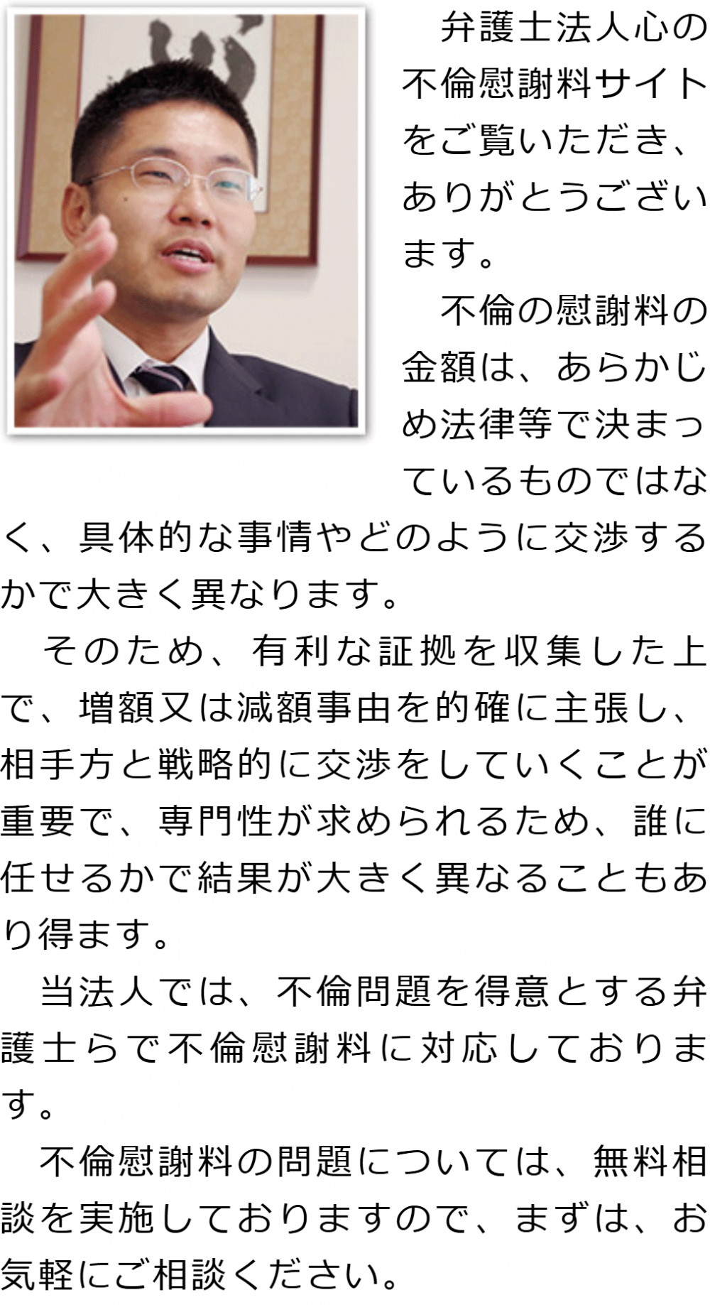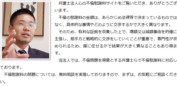 トップその他代表メッセージ 階層構造▼ その他(目次) 代表メッセージ 代表メッセージ その他(目次)その他トップ共通バナー元※消さない心グループニュース電話相談・テレビ電話相談について代表メッセージ慰謝料請求の流れお客様相談室グループ概要関連リンクプライバシーポリシーサイトマップ 受付時間 平日 9時~21時、土日祝 9時~18時夜間・土日祝の相談も対応します(要予約) 所在地 〒111-1111 ●町●●建物● (●弁護士会●) 0120-41-2403 お問合せ・アクセス・地図