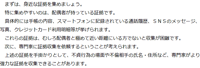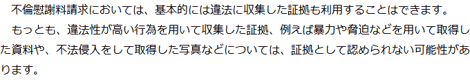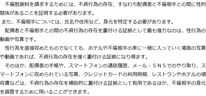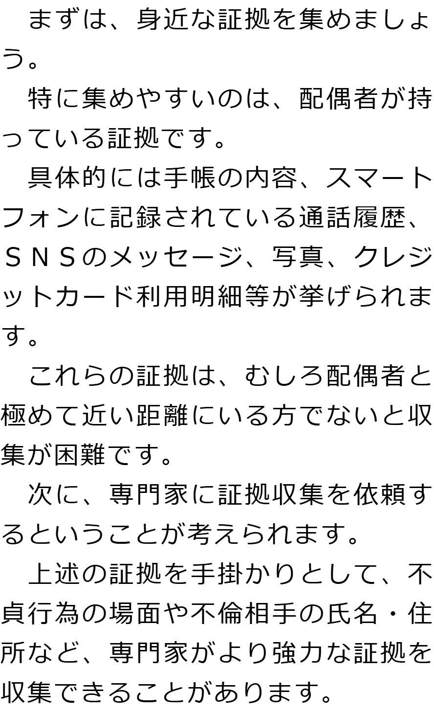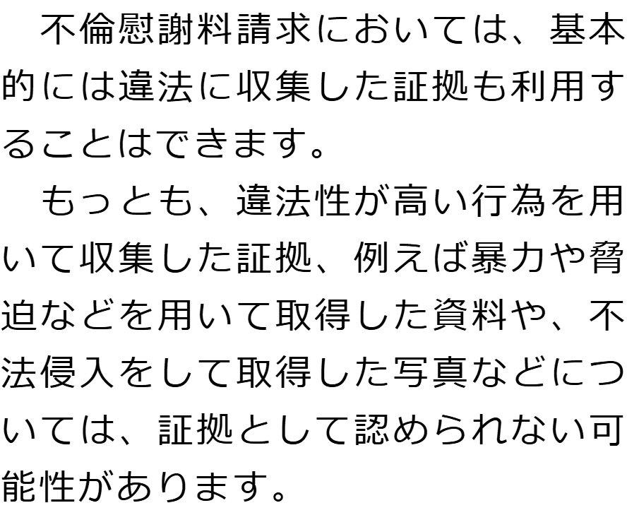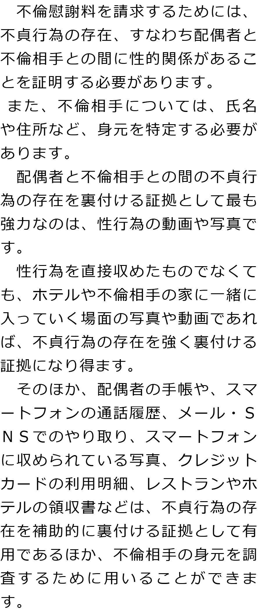 不倫慰謝料の証拠に関するQ&AQどのようなものが証拠になりますか?Qどのように証拠を集めればいいですか?Q不倫慰謝料の証拠を集める際に注意すべきことはありますか?Q不倫慰謝料の証拠として認められないものはありますか? Qどのようなものが証拠になりますか?AQどのように証拠を集めればいいですか?AQ不倫慰謝料の証拠を集める際に注意すべきことはありますか?AQ不倫慰謝料の証拠として認められないものはありますか?A お役立ち情報・Q&A(目次)お役立ち情報・Q&Aトップお役立ち情報配偶者に不倫慰謝料を請求する場合の流れQ&A不倫慰謝料の証拠に関するQ&A 受付時間 平日 9時~21時、土日祝 9時~18時夜間・土日祝の相談も対応します(要予約) 所在地 〒111-1111 ●町●●建物● (●弁護士会●) 0120-41-2403 お問合せ・アクセス・地図