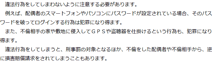 Q不倫慰謝料の証拠を集める際に注意すべきことはありますか?AQ不倫慰謝料の証拠として認められないものはありますか?A お役立ち情報・Q&A(目次)お役立ち情報・Q&Aトップお役立ち情報配偶者に不倫慰謝料を請求する場合の流れQ&A不倫慰謝料の証拠に関するQ&A 受付時間 平日 9時~21時、土日祝 9時~18時夜間・土日祝の相談も対応します(要予約) 所在地 〒111-1111 ●町●●建物● (●弁護士会●) 0120-41-2403 お問合せ・アクセス・地図
