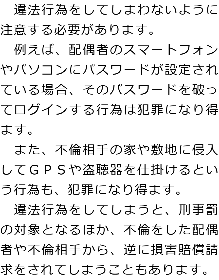 トップお役立ち情報・Q&AQ&A不倫慰謝料の証拠に関するQ&A 階層構造▼ お役立ち情報・Q&A(目次) 不倫慰謝料の証拠に関するQ&AQどのようなものが証拠になりますか?Qどのように証拠を集めればいいですか?Q不倫慰謝料の証拠を集める際に注意すべきことはありますか?Q不倫慰謝料の証拠として認められないものはありますか? Qどのようなものが証拠になりますか?AQどのように証拠を集めればいいですか?AQ不倫慰謝料の証拠を集める際に注意すべきことはありますか?AQ不倫慰謝料の証拠として認められないものはありますか?A お役立ち情報・Q&A(目次)お役立ち情報・Q&Aトップお役立ち情報配偶者に不倫慰謝料を請求する場合の流れQ&A不倫慰謝料の証拠に関するQ&A 受付時間 平日 9時~21時、土日祝 9時~18時夜間・土日祝の相談も対応します(要予約) 所在地 〒111-1111 ●町●●建物● (●弁護士会●) 0120-41-2403 お問合せ・アクセス・地図