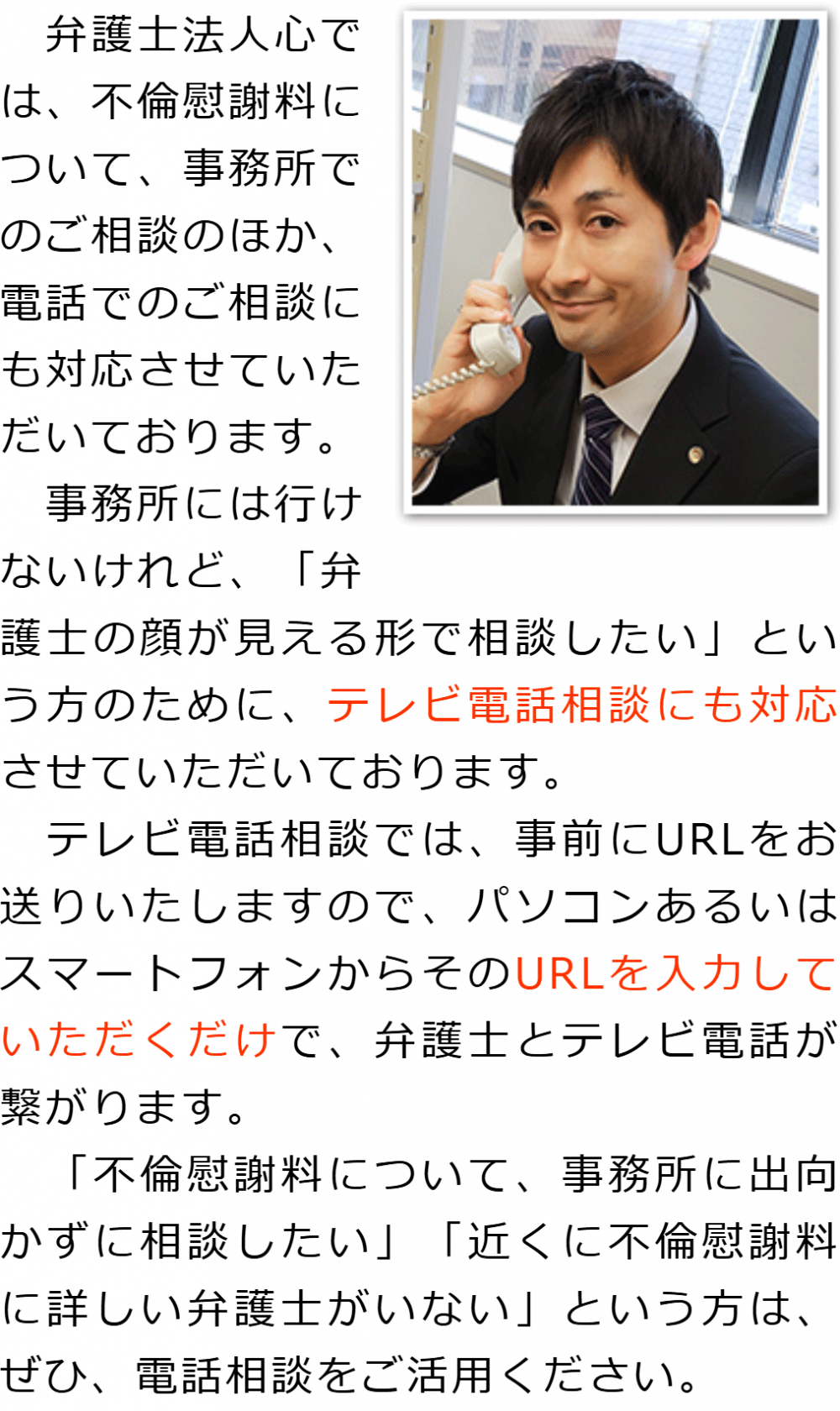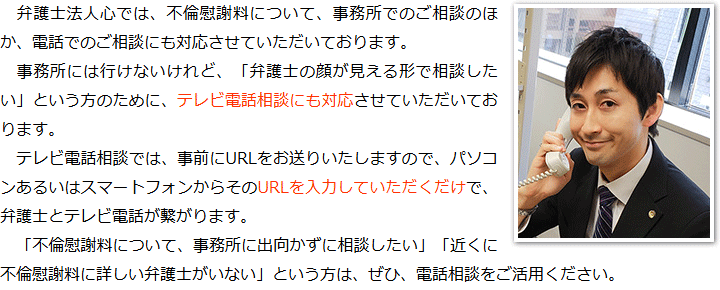 トップその他電話相談・テレビ電話相談について 階層構造▼ その他(目次) 電話相談・テレビ電話相談について その他(目次)その他トップ共通バナー元※消さない心グループニュース電話相談・テレビ電話相談について代表メッセージ慰謝料請求の流れお客様相談室グループ概要関連リンクプライバシーポリシーサイトマップ 受付時間 平日 9時~21時、土日祝 9時~18時夜間・土日祝の相談も対応します(要予約) 所在地 〒111-1111 ●町●●建物● (●弁護士会●) 0120-41-2403 お問合せ・アクセス・地図